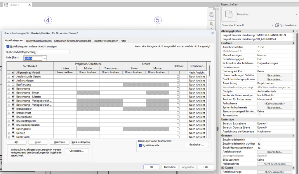 Mit dem Shortcut VG / VV können die Sichtbarkeit und grafische Darstellung von Modellelementen, Bezugselementen und ansichtsspezifischen Elementen für jede Ansicht im Projekt gesteuert werden.