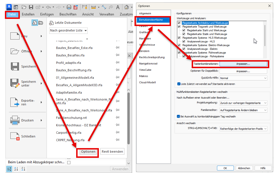 Datei ⟶ Optionen ⟶ Benutzeroberfläche ⟶ Tastenkombinationen: Anpassen